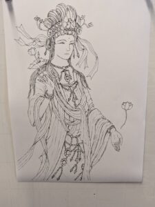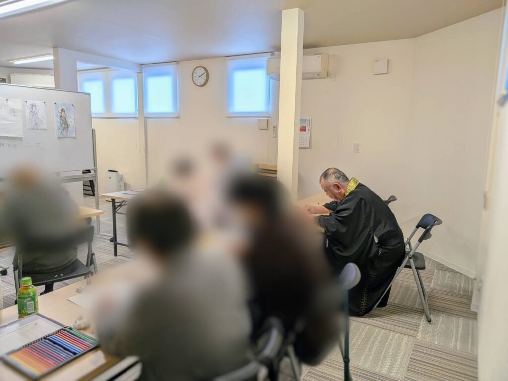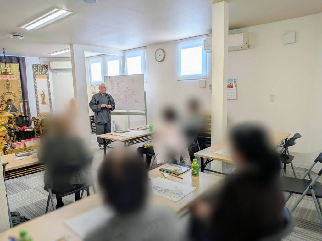 第11回では、「写仏会」を開催しました。写仏とは、仏様の姿を絵として描くことで、仏の教えに心を向ける貴重な時間です。今回は、佐々木院代(院代とは、住職の代わりにお寺の法務を担当される方)を講師としてお迎えし、参加者全員で仏様の姿を丁寧に描く時間を持ちました。