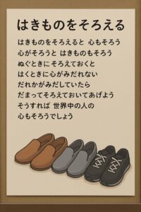 藤本幸邦 様 作 この文章は、日常の小さな行いが心のあり方に深く関わっていることを示した、とてもシンプルで味わい深い教えです。はきものをそろえるという、ほんの数秒でできる動作でも、丁寧に行うことで自分の心が落ち着き、整っ […]